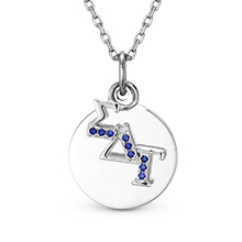 A modern twist on a drop lavaliere, our Demi Necklace features your Greek letters on a staggered diagonal charm on top of a separate, polished round disc. The official colors of your sorority are represented with stones that accent the letters and add a pop of shine and color! The Demi comes complete with an attached 16” chain with a 4” extender so you can wear at the length of your choosing, and is available in sterling silver or sterling silver with a gold plating. It makes a great ‘treat yourself’ gift, holiday gift, ‘just because’ sister surprise present, or for any occasion, as it keeps your connection to your sisterhood close to your heart with a fashionable flair. Disc charm measures about 1.5 cm in diameter.