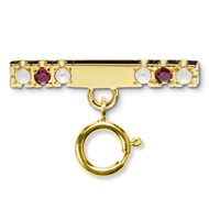 This pin is the perfect way to showcase your favorite charms. Attached spring ring makes it easy to attach different charms. Set with 4 genuine pearls and 2 synthetic garnet stones. 7/8" length