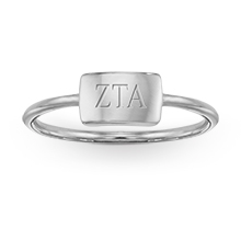 Delicate and dainty, our trendy new ring is a must have for your sorority jewelry collection! Available in sizes 6-9, you will love this minimalistic but meaningful style with your letters engraved on a curved bar. Available in both silver and gold tone (GE) to match your preference! Measures 11.9 mm x 3.8 mm.